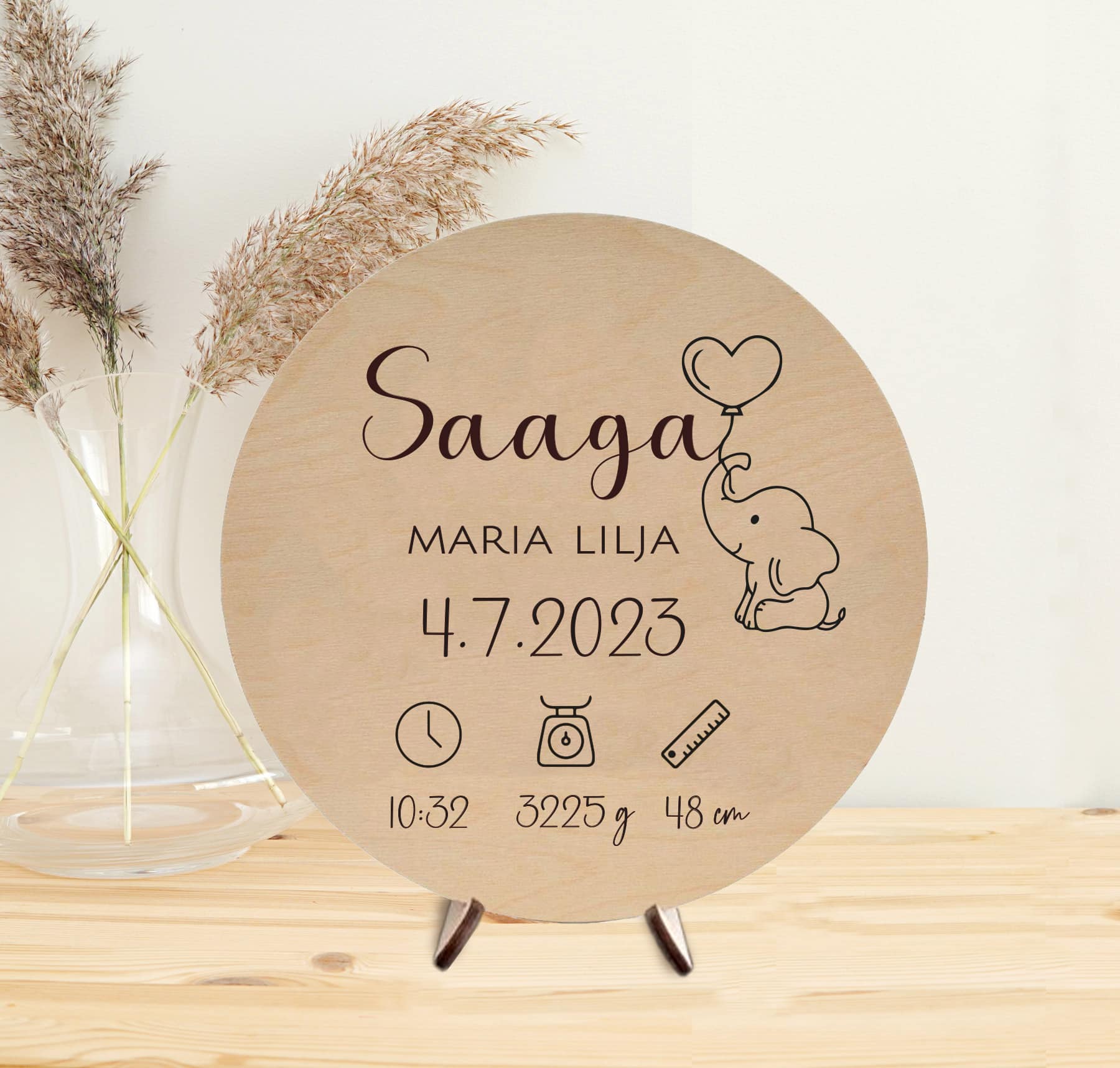 Tähän suloiseen puiseen norsu syntymätauluun tulee nimen ja syntymätietojen lisäksi ihana norsu. Norsun lisäksi tässä syntymätaulussa yhdistyy samat symbolit kuin Symbolit -syntymätaulussa eli painoa, pituutta ja kellonaikaa symboloivat kuviot kaiverretaan tauluun myös.