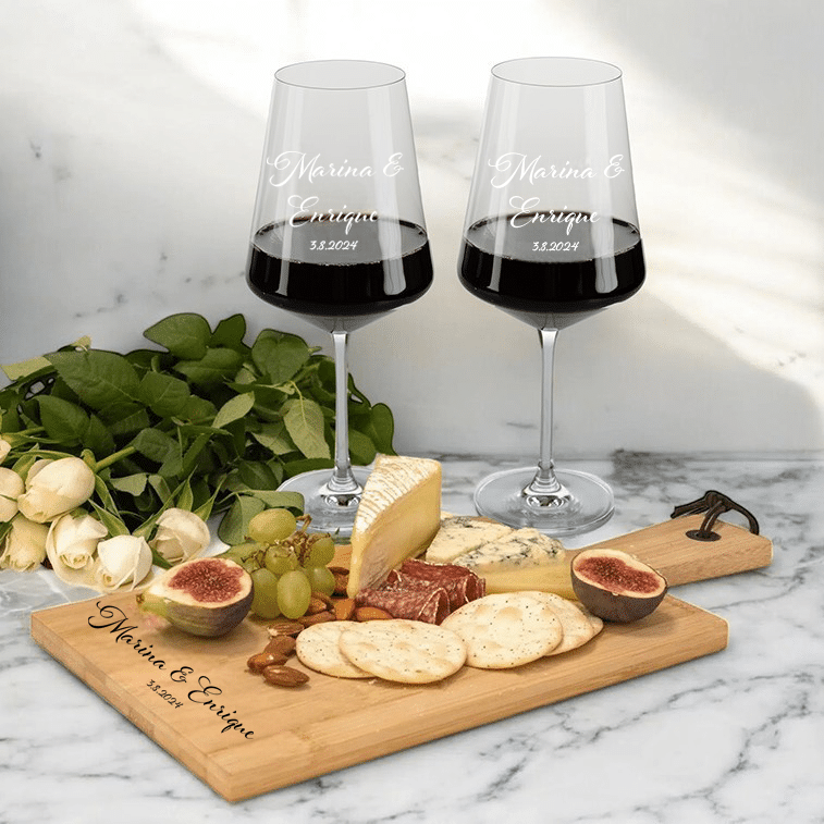 Copas de vino y tabla de servir con grabado personalizado – un regalo elegante y único para parejas
