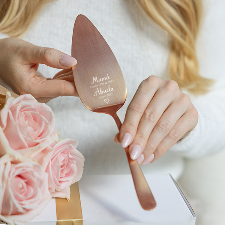 Disponible en color oro rosa o dorado, la pala está fabricada en acero inoxidable de alta calidad, lo que garantiza su resistencia y durabilidad. Además, puede lavarse cómodamente en el lavavajillas sin que el grabado pierda su brillo. El grabado láser es permanente, asegurando que el mensaje o nombre elegido se conserve intacto con el paso del tiempo.