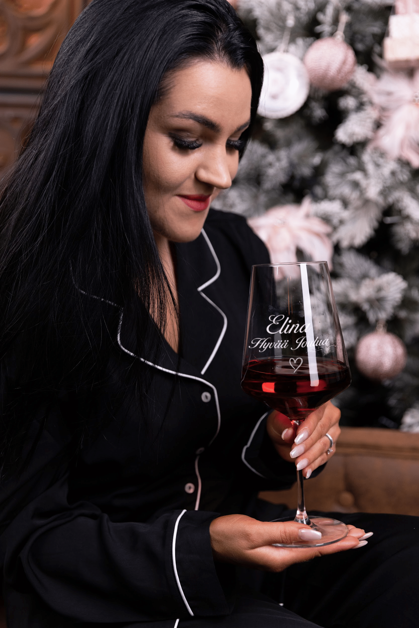 Punaviinilasi kaiverruksella on sekä yksilöllinen, että käytännöllinen joululahja. Sopisiko kylkeen kenties pullo lahjansaajan lempiviiniä? Lasin kauniisti kaartuva muoto tekee siitä miellyttävän pitää kädessä ja tehostaa hyvin viinin aromeja. Viinilasi on valmistettu laadukkaasta lasista, joten tämä viinilasi on paitsi kaunis myös kestävä. Kaiverrus ei haalistu tai kulu pois, joten lasista jää ihana muisto jopa vuosiksi eteenpäin.